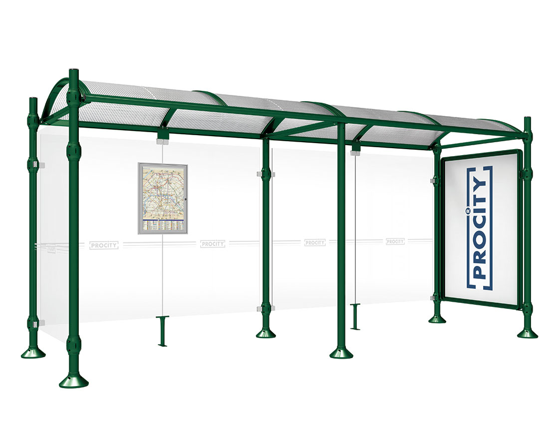 Wartehalle Province Gebürsteter Edelstahl Farbe:RAL 6005|Länge:5000 mm|Struktur:Mit Schaukasten 2000 und eienr Seitenverkleidung