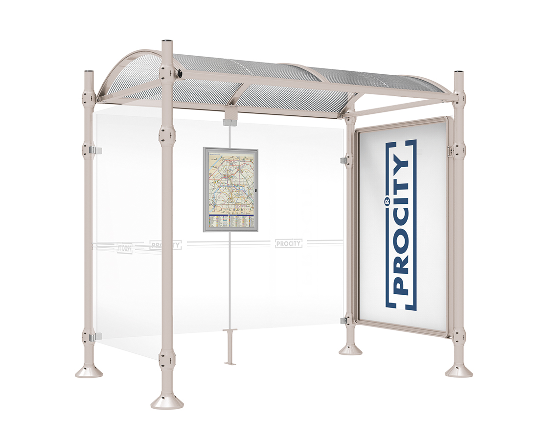 Wartehalle Province Gebürsteter Edelstahl Farbe:RAL 7044|Länge:2500 mm|Struktur:Mit Schaukasten 2000 und eienr Seitenverkleidung