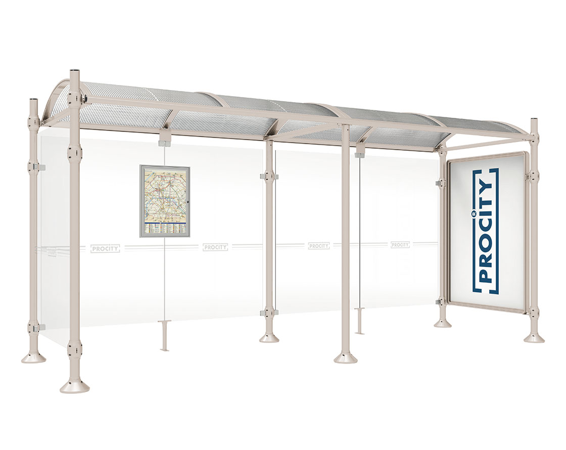Wartehalle Province Gebürsteter Edelstahl Farbe:RAL 7044|Länge:5000 mm|Struktur:Mit Schaukasten 2000 und eienr Seitenverkleidung