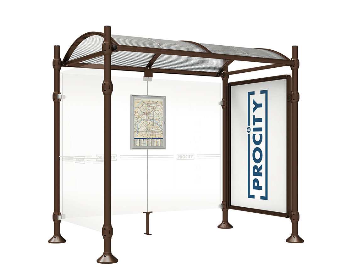 Wartehalle Province Gebürsteter Edelstahl Farbe:RAL 8017|Länge:2500 mm|Struktur:Mit Schaukasten 2000 und eienr Seitenverkleidung