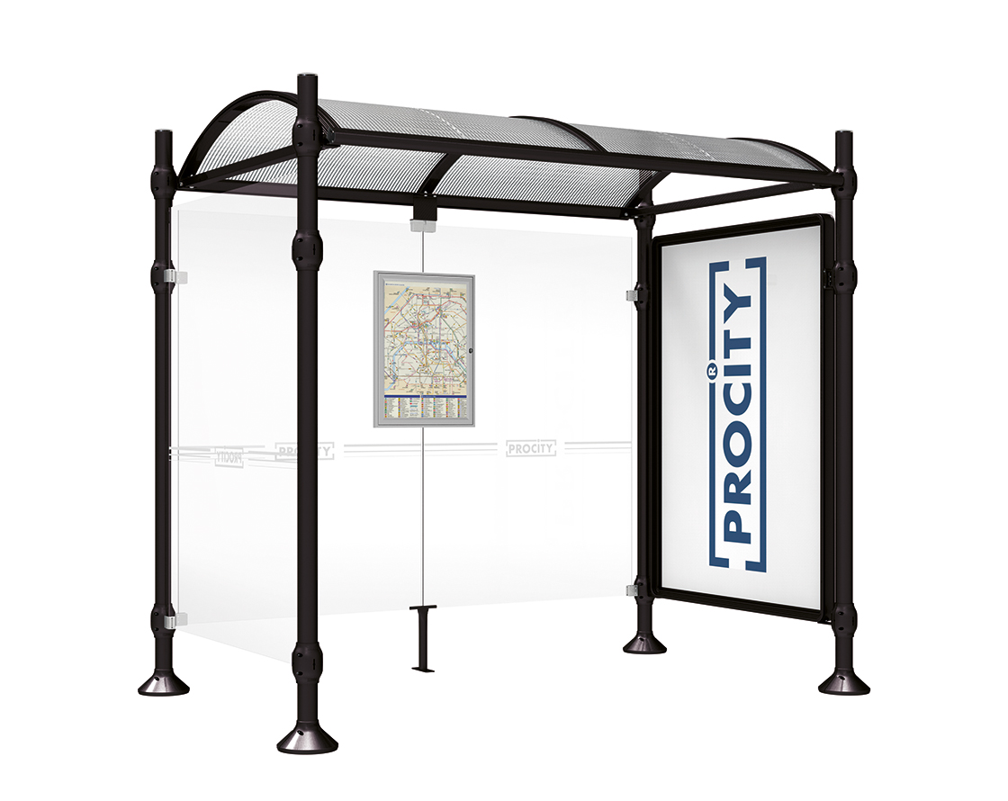 Wartehalle Province Gebürsteter Edelstahl Farbe:RAL 9005|Länge:2500 mm|Struktur:Mit Schaukasten 2000 und eienr Seitenverkleidung