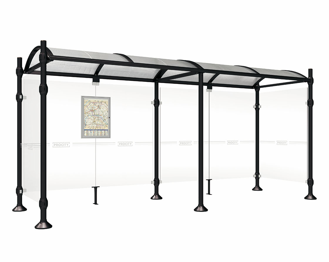 Wartehalle Province Gebürsteter Edelstahl Farbe:RAL 9005|Länge:5000 mm|Struktur:Mit 2 Seitenverkleidungen