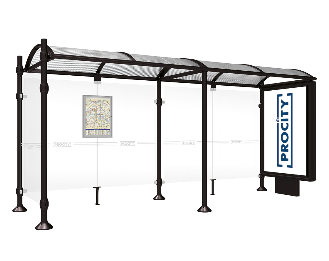 Wartehalle Province Gebürsteter Edelstahl Farbe:RAL 9005|Länge:5000 mm|Struktur:Mit Leuchtcaisson und einer Seitenverkleidung