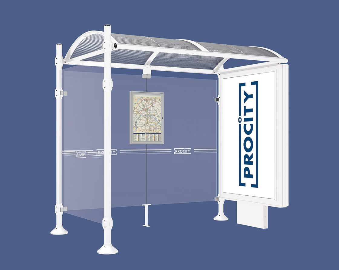 Wartehalle Province Gebürsteter Edelstahl Farbe:RAL 9010|Länge:2500 mm|Struktur:Mit Leuchtcaisson und einer Seitenverkleidung