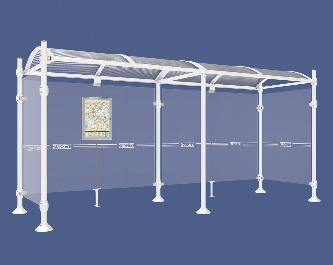 Wartehalle Province Gebürsteter Edelstahl Farbe:RAL 9010|Länge:5000 mm|Struktur:Mit 2 Seitenverkleidungen