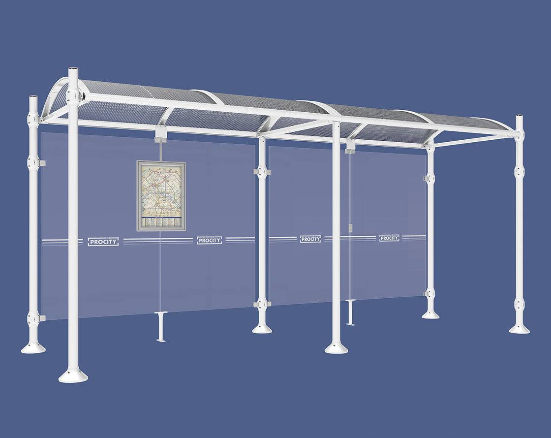 Wartehalle Province Gebürsteter Edelstahl Farbe:RAL 9010|Länge:5000 mm|Struktur:Ohne Seitenverkleidung