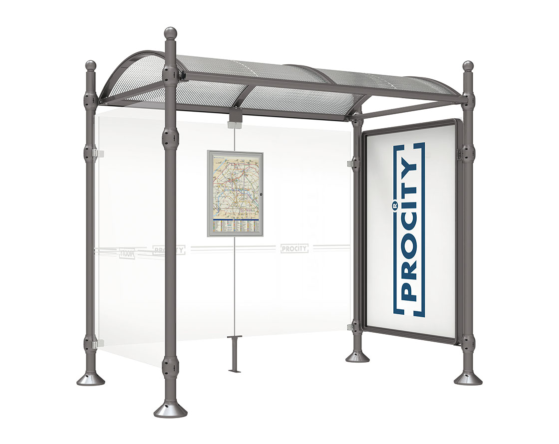 Wartehalle Province Kugel Farbe:Procity grau|Länge:2500 mm|Struktur:Mit Schaukasten 2000 und eienr Seitenverkleidung