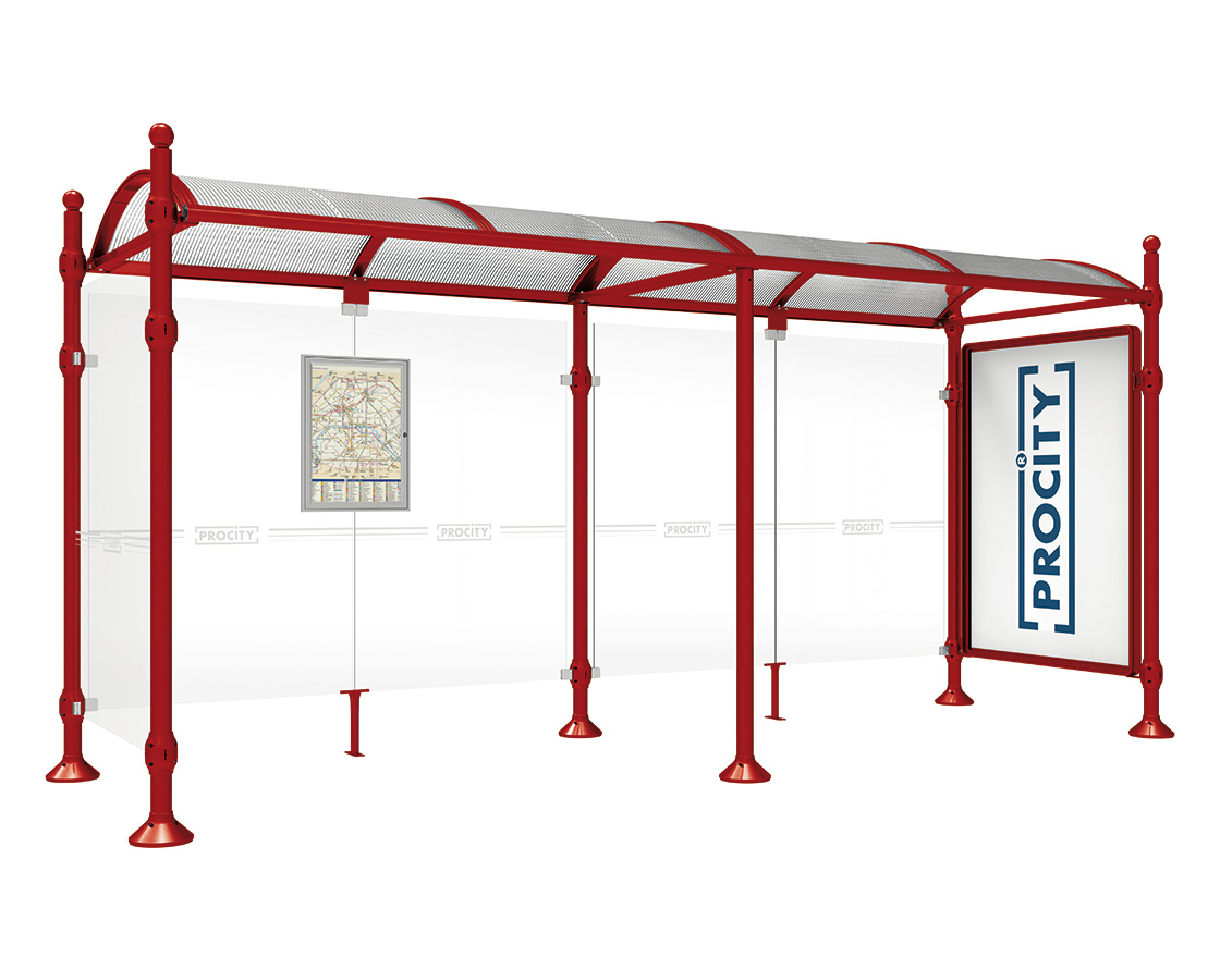 Wartehalle Province Kugel Farbe:RAL 3004|Länge:5000 mm|Struktur:Mit Schaukasten 2000 und eienr Seitenverkleidung