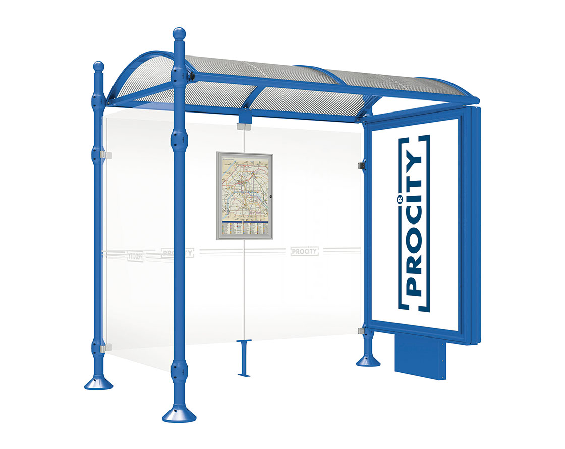 Wartehalle Province Kugel Farbe:RAL 5010|Länge:2500 mm|Struktur:Mit Leuchtcaisson und einer Seitenverkleidung