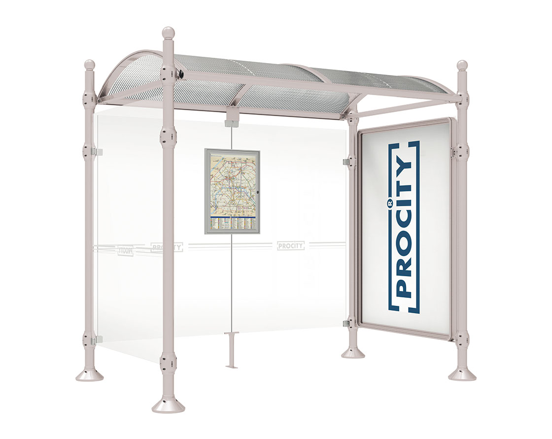 Wartehalle Province Kugel Farbe:RAL 7044|Länge:2500 mm|Struktur:Mit Schaukasten 2000 und eienr Seitenverkleidung