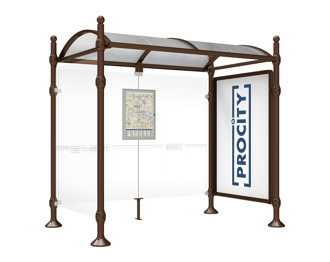 Wartehalle Province Kugel Farbe:RAL 8017|Länge:2500 mm|Struktur:Mit Schaukasten 2000 und eienr Seitenverkleidung
