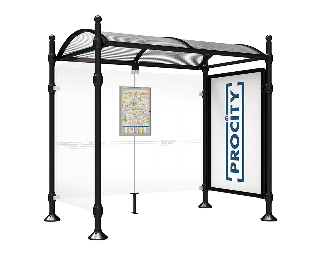 Wartehalle Province Kugel Farbe:RAL 9005|Länge:2500 mm|Struktur:Mit Schaukasten 2000 und eienr Seitenverkleidung