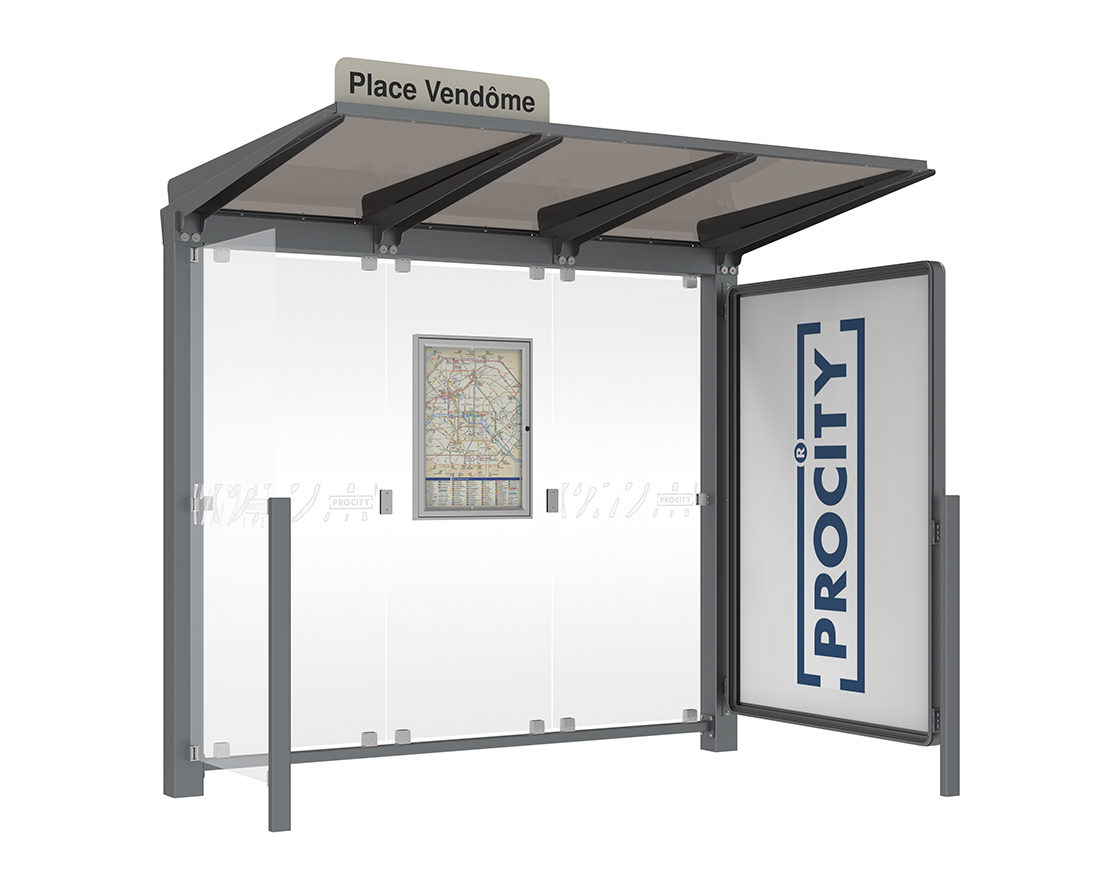 Wartehalle Venedig Farbe:Procity grau|Länge:2500 mm|Struktur:Mit Schaukasten 2000 und eienr Seitenverkleidung