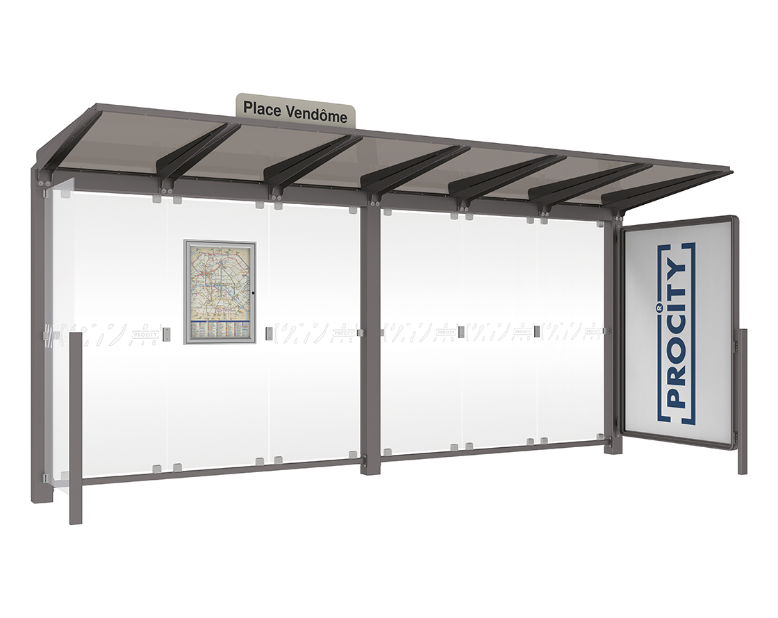 Wartehalle Venedig Farbe:Procity grau|Länge:5000 mm|Struktur:Mit Schaukasten 2000 und eienr Seitenverkleidung