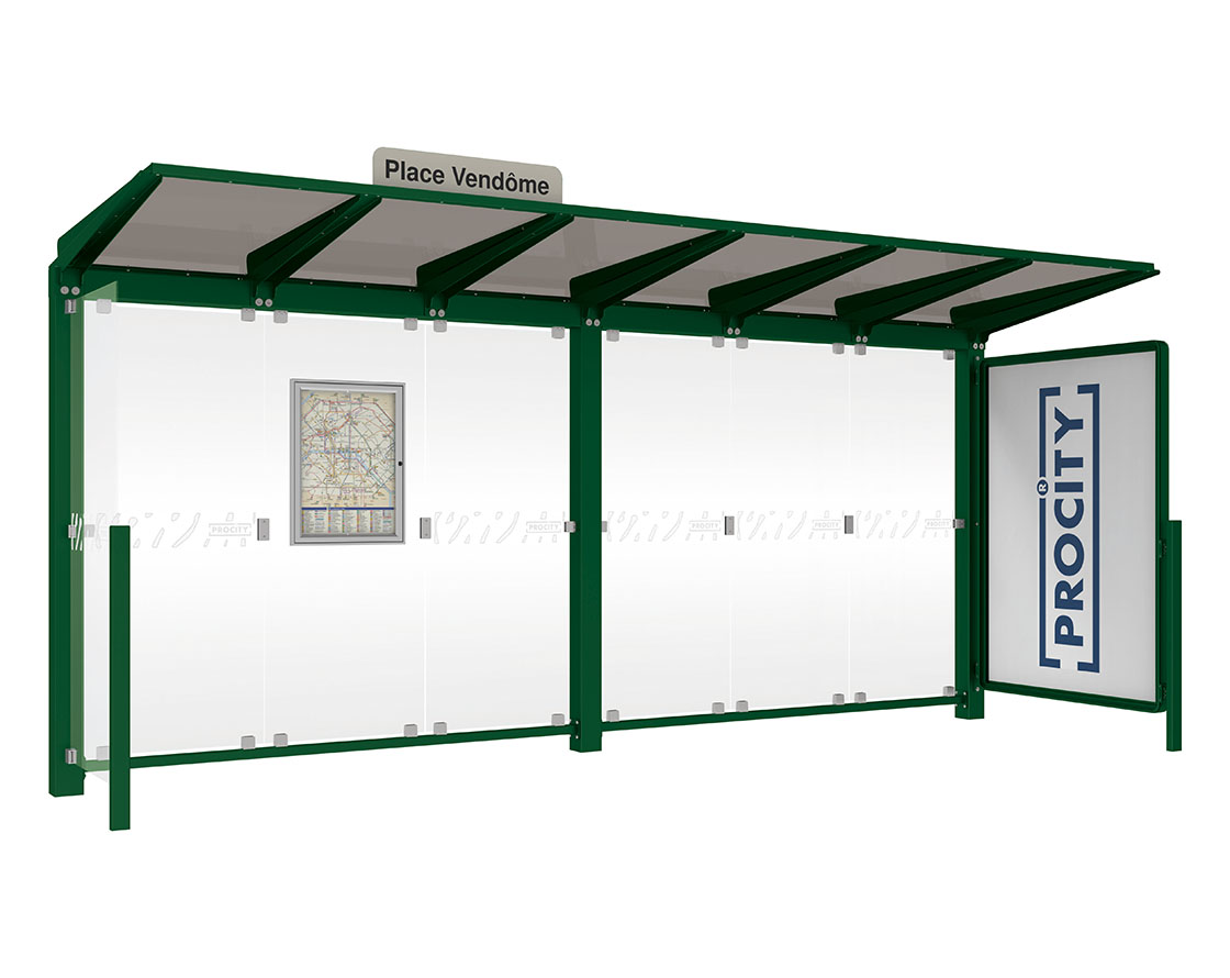 Wartehalle Venedig Farbe:RAL 6005|Länge:5000 mm|Struktur:Mit Schaukasten 2000 und eienr Seitenverkleidung