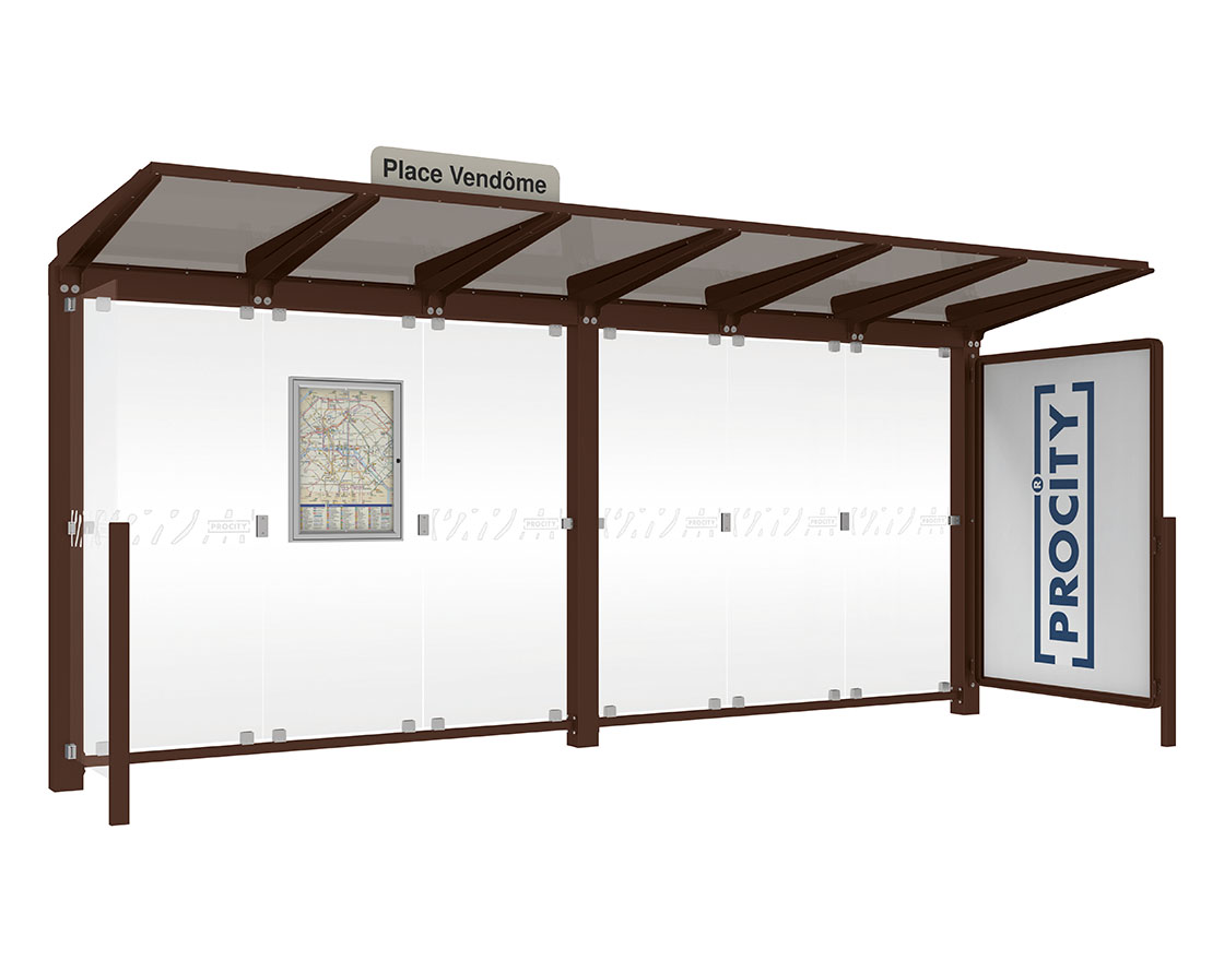 Wartehalle Venedig Farbe:RAL 8017|Länge:5000 mm|Struktur:Mit Schaukasten 2000 und eienr Seitenverkleidung