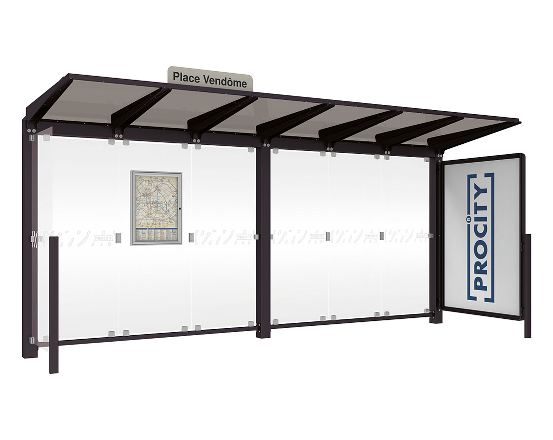 Wartehalle Venedig Farbe:RAL 9005|Länge:5000 mm|Struktur:Mit Schaukasten 2000 und eienr Seitenverkleidung